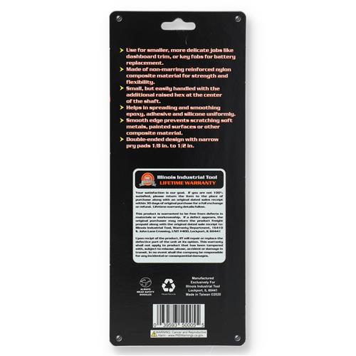 WHOLESALE: 3PC NON MARRING MINI PRY BAR SET. These Illinois Industrial Tool non-marring precision pry bar tools are ideal for using on smaller, more delicate, jobs like dashboard trim, or key fobs for battery replacement. Made of non-marring reinforced nylon composite material for strength and flexibility. Small, but easily handled with the additional raised hex at the center of the shaft. Helps in spreading and smoothing epoxy, adhesive and silicone uniformly. Smooth edge prevents scratching soft metals, painted surfaces or other composite material. Double-ended design with narrow pry pads 1/8'' to 1/2''.Illinois Industrial Tools